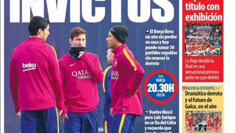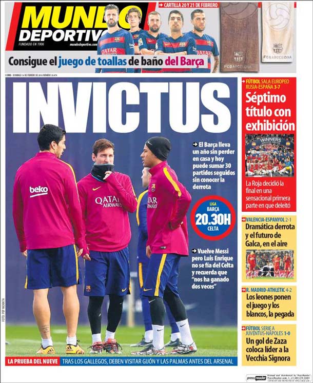 Portada del periódico Mundo Deportivo, domingo 14 de febrero de 2016. El Barça lleva un año sin perder en casa y hoy puede sumar 30 partidos seguidos sin conocer la derrota. Vuelve Messi, pero Luis Enrique no se fía del Celta y recuerda que "nos ha ganado dos veces".