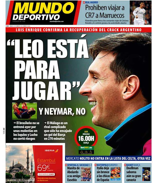 Portada del periódico Mundo Deportivo, sábado 23 de enero de 2016. Luis Enrique confirma la recuperación del crack argentino. Neymar no se entrenó ayer por unas molestias en los isquios y Lucho no corrió riesgos. El Málaga es un rival complicado que sólo ha encajado un gol del Barça en 270'.