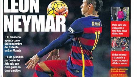 Portada del periódico Mundo Deportivo, martes 19 de enero de 2016. El brasileño apunta como único miembro del tridente en San Mamés. Es la pesadilla particular del Athletic, con cinco goles en cinco partidos. Messi sufre una elongación y será duda hasta última hora.