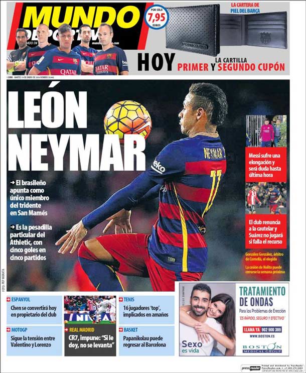 Portada del periódico Mundo Deportivo, martes 19 de enero de 2016. El brasileño apunta como único miembro del tridente en San Mamés. Es la pesadilla particular del Athletic, con cinco goles en cinco partidos. Messi sufre una elongación y será duda hasta última hora.
