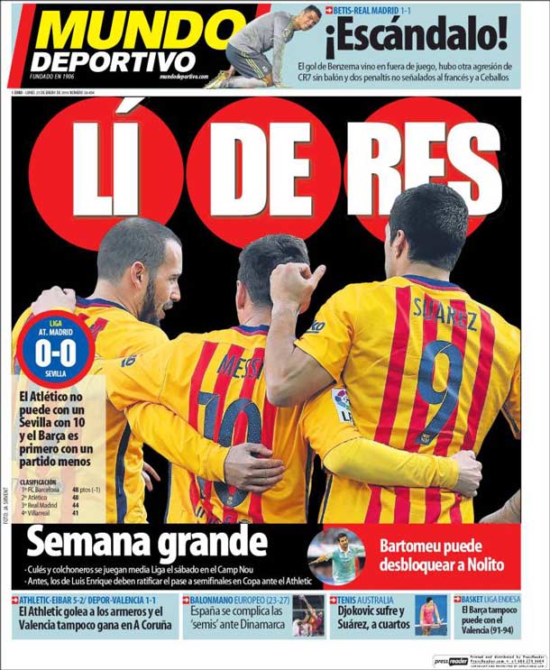 Portada del periódico Mundo Deportivo, lunes 25 de enero de 2016. El Atlético no puede con un Sevilla con 10 y el Barça es primero con un partido menos. ¡Escándalo! El gol de Benzema vino en fuera de juego, hubo otra agresión de CR7 sin balón y dos penaltis no señalados al francés y a Ceballos.