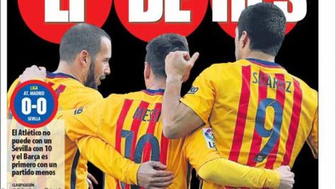 Portada del periódico Mundo Deportivo, lunes 25 de enero de 2016. El Atlético no puede con un Sevilla con 10 y el Barça es primero con un partido menos. ¡Escándalo! El gol de Benzema vino en fuera de juego, hubo otra agresión de CR7 sin balón y dos penaltis no señalados al francés y a Ceballos.