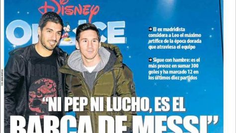 Portada del periódico Mundo Deportivo, viernes 19 de febrero de 2016. Jorge Valdano considera a Leo el máximo artífice de la época dorada que atraviesa el equipo. Sigue con hambre: es el más precoz en sumar 300 goles y ha marcado 12 en los últimos diez partidos.