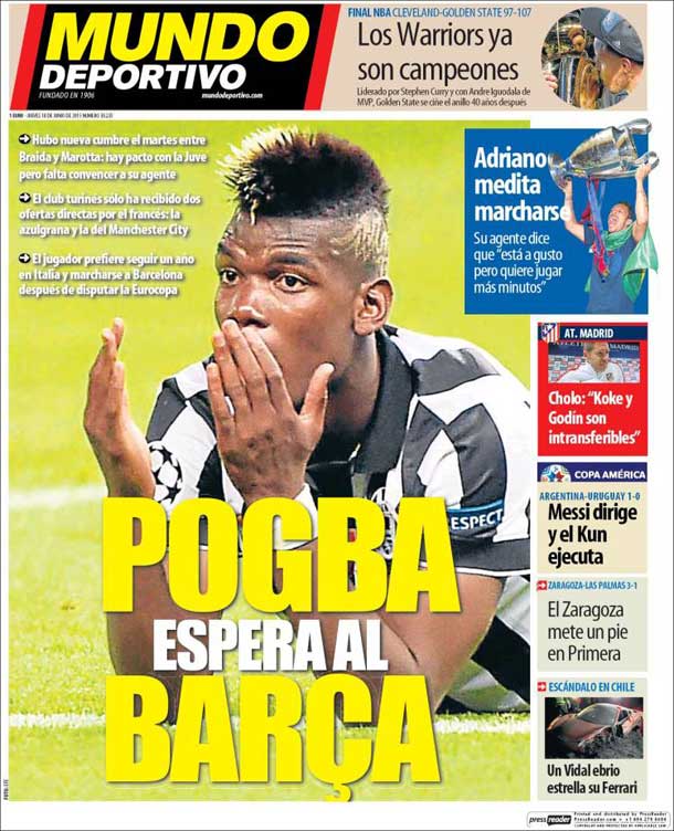 Portada del diario Mundo Deportivo, jueves 18 de junio de 2015. Hubo nueva cumbre el martes entre Braida y Marotta: hay pacto con la Juve pero falta convencer a su agente. El club turinés sólo ha recibido dos ofertas directas por el francés: la azulgrana y la del Manchester City. El jugador prefiere seguir un año en Italia y marcharse a Barcelona después de disputar la Eurocopa.