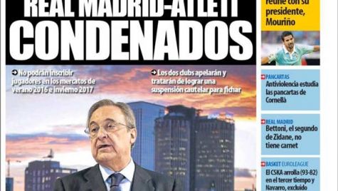 Portada del periódico Mundo Deportivo, viernes 15 de enero de 2016. Real Madrid y Atlético no podrán inscribir jugadores en los mercados de verano 2016 e invierno 2017. Los dos clubs apelarán y tratarán de lograr una suspensión cautelar para fichar.
