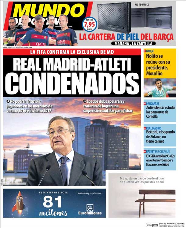 Portada del periódico Mundo Deportivo, viernes 15 de enero de 2016. Real Madrid y Atlético no podrán inscribir jugadores en los mercados de verano 2016 e invierno 2017. Los dos clubs apelarán y tratarán de lograr una suspensión cautelar para fichar.