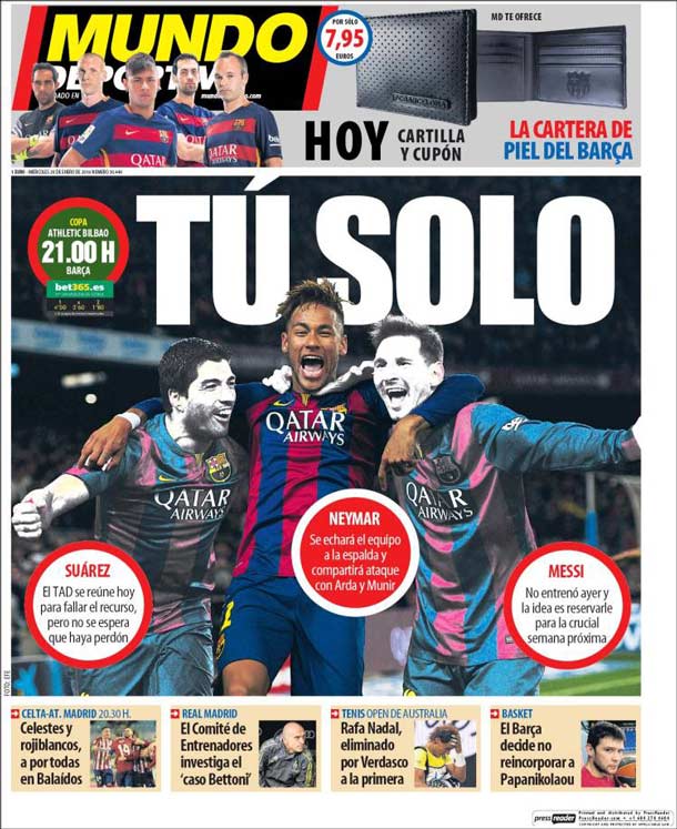 Portada del periódico Mundo Deportivo, miércoles 20 de enero de 2016. Neymar se echará el equipo a la espalda y compartirá ataque con Arda y Munir. El TAD se reúne hoy para fallar el recurso por Luis Suárez, pero no se espera que haya perdón. Messi no entrenó ayer y la idea es reservarle.