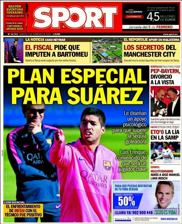 Portada Sport (03/02/2015) - Plan especial para Suárez