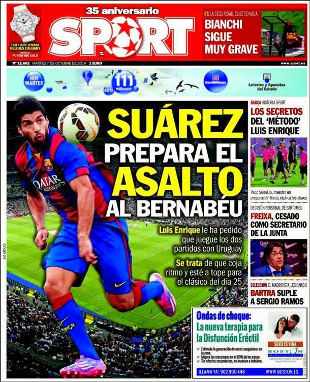 Portada Sport (07/10/2014) - Suárez prepara el asalto al Bernabéu