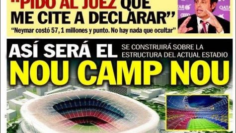 Portada Sport, martes 21 de Enero de 2014. "Así será el nuevo Camp Nou". Se construirá sobre la estructura del actual estadio. 600 millones de coste, 105.000 espectadores y 4 años de obras (2017-2021). | "Pido al juez que me cite a declarar". Rosell contesta a la denuncia del diario El Mundo sobre la operación Neymar.