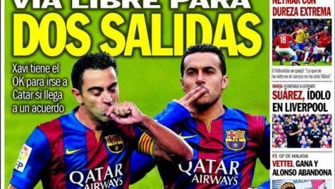 Portada del periódico Sport, lunes 30 de marzo de 2015. El Barça está preparado para prescindir de Xavi y Pedro. Xavi tiene el OK para irse a Qatar si llega a un acuerdo. Pedro se marchará si trae una oferta superior a los 20 millones de euros.