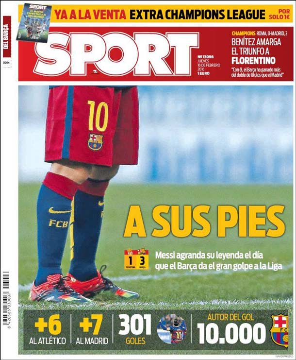 Portada del periódico Sport, jueves 18 de febrero de 2016. Messi agranda su leyenda el día que el Barça da el gran golpe a la Liga. Sporting, 1 - FC Barcelona, 3.