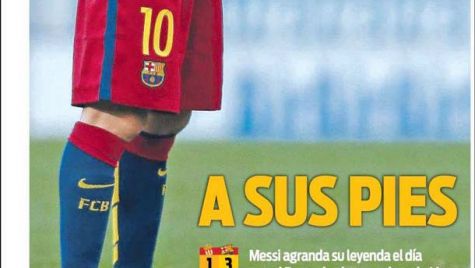 Portada del periódico Sport, jueves 18 de febrero de 2016. Messi agranda su leyenda el día que el Barça da el gran golpe a la Liga. Sporting, 1 - FC Barcelona, 3.