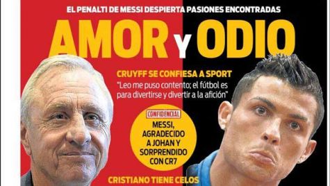 Portada del periódico Sport, miércoles 17 de febrero de 2016. El penalti de Messi despierta pasiones encontradas. Cruyff se confiesa a Sport: "Leo me puso contento; el fútbol es para divertirse y divertir a la afición". Cristiano tiene celos: "Yo sé por qué hizo esto... y pensad lo que queráis".