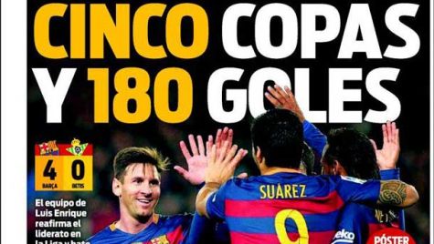Portada del periódico Sport, jueves 31 de diciembre de 2015. El Barça puso la guinda a un año inolvidable. El equipo de Luis Enrique reafirma el liderato en la Liga y bate otro récord histórico.