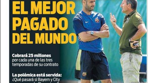 Portada del periódico Sport, martes 2 de febrero de 2016. Guardiola fichará por el City en julio. Cobrará 25 millones por cada una de las tres temporadas de su contrato. La polémica está servida: ¿Qué pasará si Bayern y City se cruzan en la Champions?