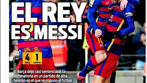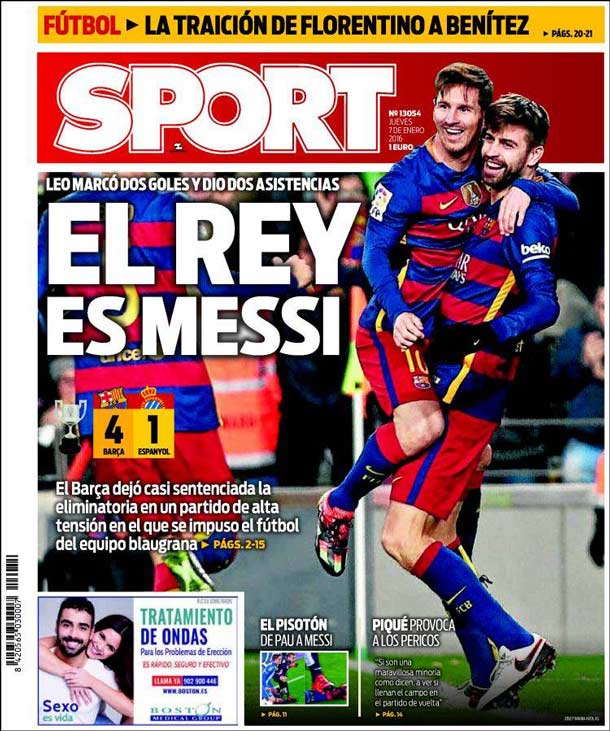 Portada del periódico Sport, jueves 7 de enero de 2016. Leo Messi marcó dos goles y dio dos asistencias. El Barça dejó casi sentenciada la eliminatoria contra el ESpanyol en un partido de alta tensión en el que se impuso el fútbol del equipo blaugrana.
