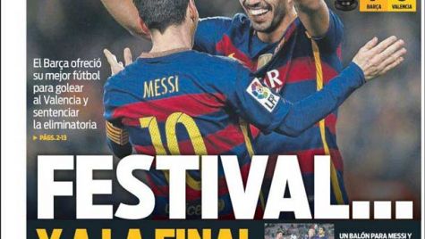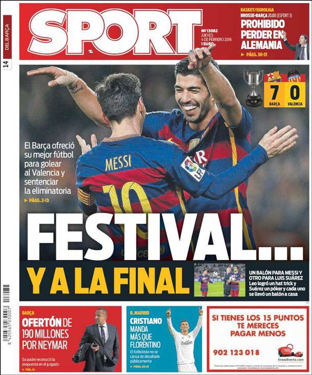 Portada del periódico Sport, jueves 4 de febrero de 2016. El Barça ofreció su mejor fútbol para golear al Valencia 7-0 y sentenciar la eliminatoria. Messi logró un "hat-trick" y Suárez un póker.