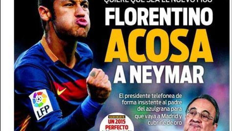 Portada del periódico Sport, domingo 27 de diciembre de 2015. Quiere que sea el nuevo Figo: el presidente telefonea de forma insistente al padre de Neymar para que vaya al Real Madrid y cubrirle de oro. Aleix, listo para debutar. El azulgrana, a buen nivel en los 60 minutos con Catalunya.