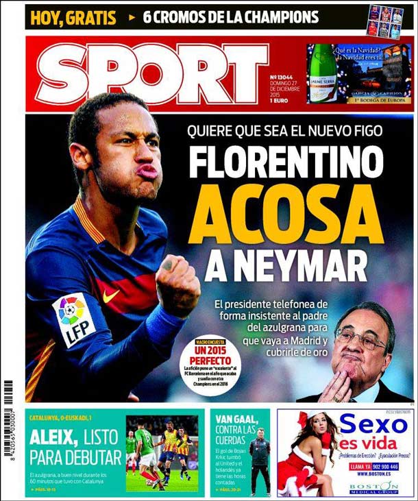 Portada del periódico Sport, domingo 27 de diciembre de 2015. Quiere que sea el nuevo Figo: el presidente telefonea de forma insistente al padre de Neymar para que vaya al Real Madrid y cubrirle de oro. Aleix, listo para debutar. El azulgrana, a buen nivel en los 60 minutos con Catalunya.