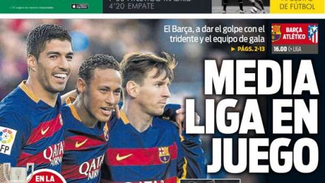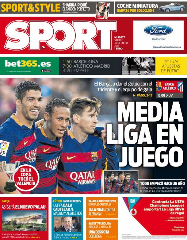 Portada del periódico Sport, sábado 30 de enero de 2016. El Barça, a dar el golpe con el tridente y el equipo de gala. La MSN ya noqueó al Atlético en el inicio de la reacción que le llevó a ganar el triplete.