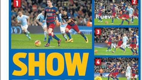 Portada del periódico Sport, lunes 15 de febrero de 2016. El Barça maravilla con la magia de Messi, que se inventó un penalti "a lo Cruyff". FC Barcelona, 6 - Celta de Vigo, 1.