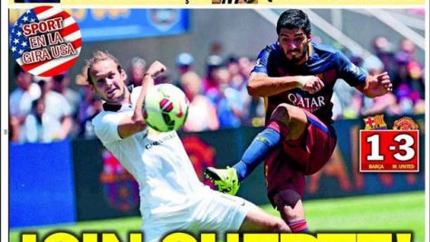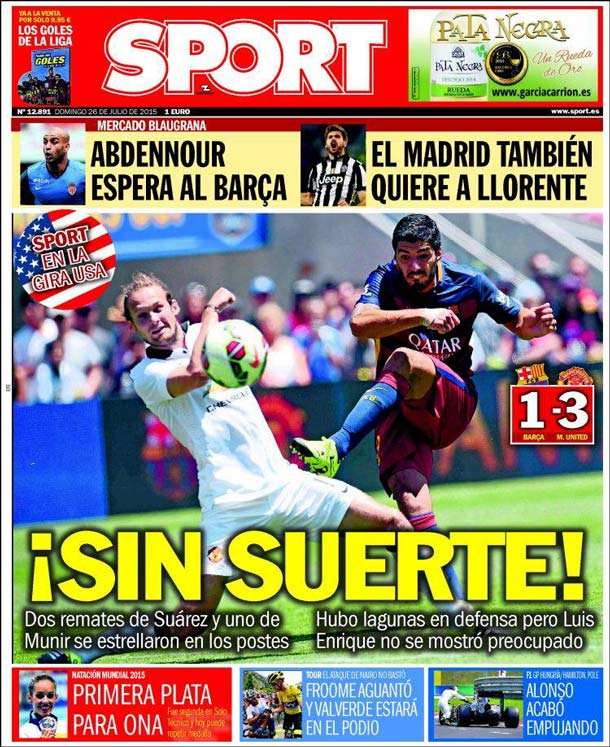 Portada del diario Sport, domingo 26 de julio de 2015. Dos remates de Suárez y uno de Munir se estrellaron en los postes. Hubo lagunas en defensa pero Luis Enrique no se mostró preocupado.