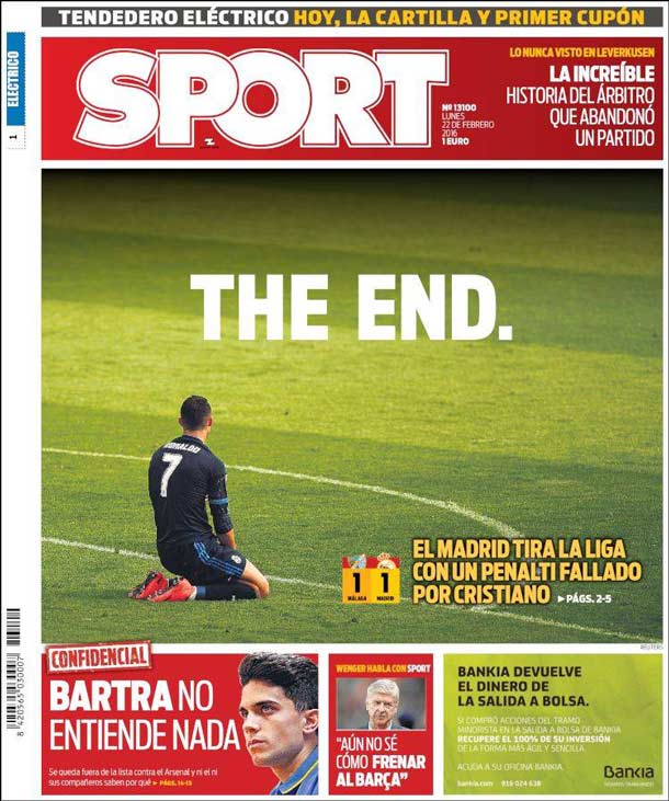 Portada del periódico Sport, lunes 22 de febrero de 2016. El Real Madrid tira la Liga con un penalti fallado por Cristiano Ronaldo. Wenger: "Aún no sé cómo frenar al Barça".