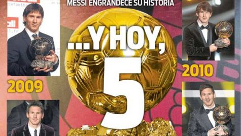 Portada del periódico Sport, lunes 11 de enero de 2016. Messi engrandece su hitoria: recibirá el quinto Balón de oro de su carrera, el mejor jugador de todos los tiempos.