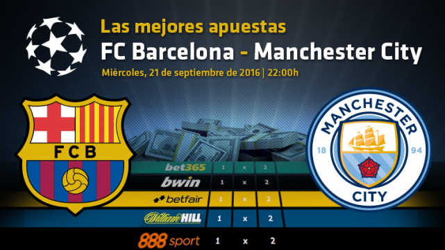 Pese al susto del FC Barcelona en el Borussia Park, los de Luis Enrique acabaron imponiéndose (1-2) en la segunda jornada del Grupo C de Champions League y, con 6 puntos en dos partidos, son los claros favoritos en las apuestas para el duelo frente al Manchester City de la tercera jornada. La victoria del Barça es la opción menos rentable en las principales casas de apuestas, aunque "William Hill" ofrece una nada desdeñable cuota de 2,03€ por euro apostado, con "Bwin" también lanzando una apetitosa oferta de 1,70€ por euro apostado en relación al triunfo azulgrana.