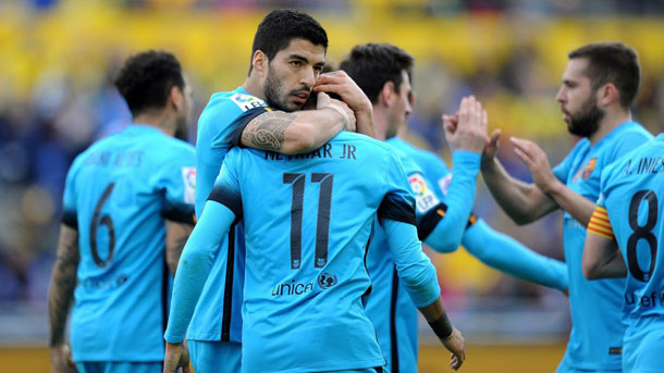La fortuna, no obstante, le faltó también a Luis Suárez en la frontal del área pequeña de Javi Varas cuando, tras un centro milimétrico de Leo Messi, remató de cabeza fuera cuando lo tenía todo a favor para colocar el segundo gol del Barça en el marcador. El uruguayo se lamentó durante treinta segundos cerrando los ojos y abrazándose al palo derecho de la portería de Varas, consciente de que había perdido una gran oportunidad, pero decidido a continuar dejándose la piel sobre el césped. El Barça, sin practicar un juego brillante, continuaba acercándose a la portería de la UD Las Palmas, errando sin embargo en el último pase y algo falto de acierto en la definición.