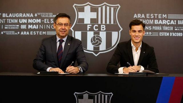 El FC Barcelona ya puede decir, alto y claro, que Philippe Coutinho es oficialmente nuevo jugador culé hasta junio de 2023. El flamante fichaje brasileño del Barcelona firmó contrato este lunes pasado el mediodía en las salas interiores del Camp Nou, acompañado del presidente del club azulgrana, Josep Maria Bartomeu, con quien se dio la mano y se abrazó en múltiples ocasiones.