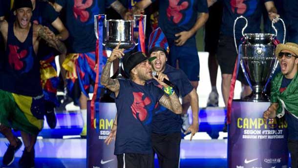 Durante las celebraciones de los jugadores en comunión con la afición del FC Barcelona en el Camp Nou, Dani Alves cogió el micro y tuvo unas palabras de admiración y dedicatoria para los 70.000 seguidores culés que asistieron al santuario azulgrana para estar cerca de sus héroes.
