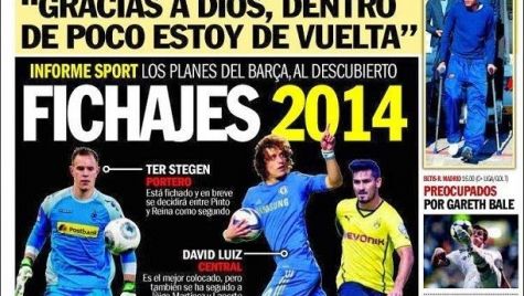 Portada Sport, sábado 18 de Enero de 2014. "Fichajes 2014: Los planes del Barça al descubierto". Ter Stegen (Portero): Está fichado y en breve se decidirá entre Pinto y Reina como segundo. | David Luiz (Central): Es el mejor colocado, pero también se ha seguido a Íñigo Martínez y Laporte. | Gundogan (Centrocampista): Ya hay negociaciones con la estrella del Dortmund. El Sevillista Rakitic está en la recámara. | Se escucharán ofertas por Alves y Alexis. El brasileñño acaba en 2015 y por el chileno el PSG pagaría 45 millones de euros. | Puyol medita irse. No quiere ser una carga para el Barça y le tienta la MLS. | Confirmado. Neymar, tres semanas y a punto para el City. "Gracias a Dios, dentro de poco estoy de vuelta". | Preocupados por Gareth Bale.