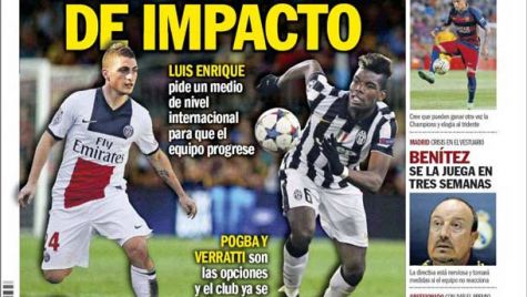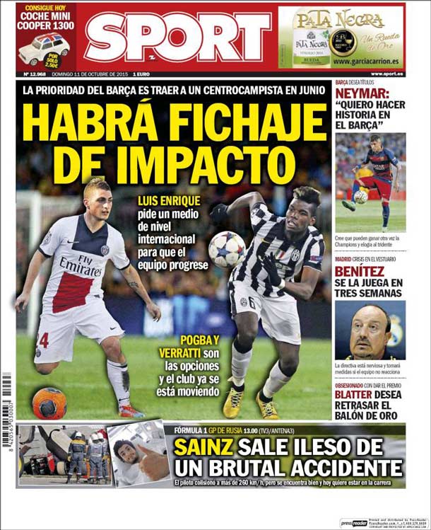 Portada del diario Sport, domingo 11 de octubre de 2015. La prioridad del Barça es traer a un centrocampista en junio. Luis Enrique pide un medio de nivel internacional para que el equipo progrese. Pogba y Verratti son las opciones y el club ya se está moviendo.