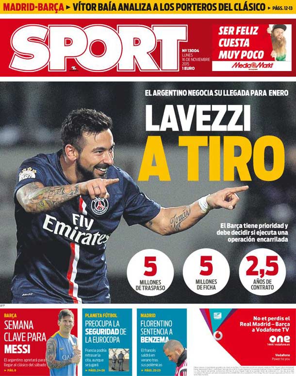 Portada del periódico Sport, lunes 16 de noviembre de 2015. El argentino negocia su llegada para enero. El Barça tiene prioridad y debe decidir si ejecuta una operación encarrilada.