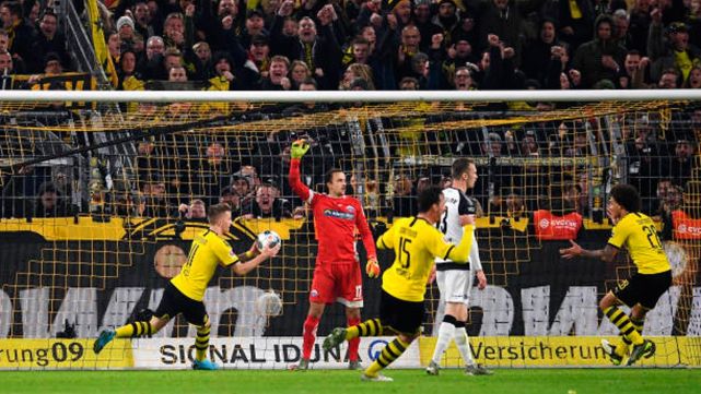 La pesadilla del Borussia todavía no había acabado y otro balón largo de Collins sirvió para que Holtmann pusiera tierra de por medio con el tercer y sorprendente gol del colista en Dortmund. Sin embargo, las cosas cambiaron radicalmente en el segundo tiempo y, tras haberse disputado solamente dos minutos, Jadon Sancho remató desde el interior del área un buen centro de Achraf.