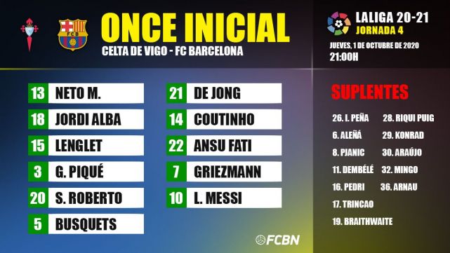 Ronald Koeman ha revelado ya la alineación con la que el FC Barcelona se enfrentará este jueves al Celta en Balaídos. Este es el XI del Barça: Neto; S. Roberto, Piqué, Lenglet, Jordi Alba; Busquets, De Jong; Coutinho, Ansu Fati, Messi y Griezmann