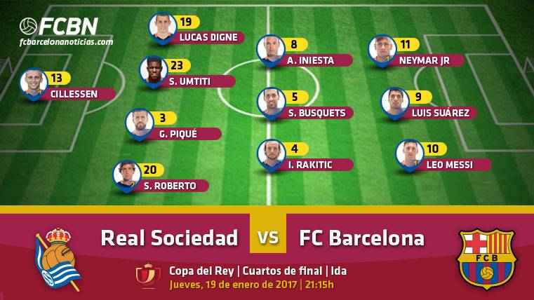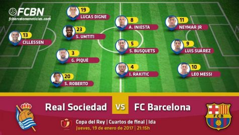 El FC Barcelona jugará con la gran mayoría de sus mejores jugadores contra la Real Sociedad en la ida de cuartos de final de Copa del Rey 2016-17. La "MSN" liderará al equipo en ataque y buscará decantar la eliminatoria de cara a la vuelta