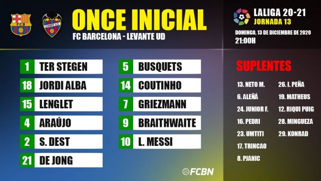 - XI del FC Barcelona: Ter Stegen; Dest, Lenglet, Araújo, Jordi Alba; Busquets, De Jong; Messi, Coutinho, Braithwaite y Griezmann.