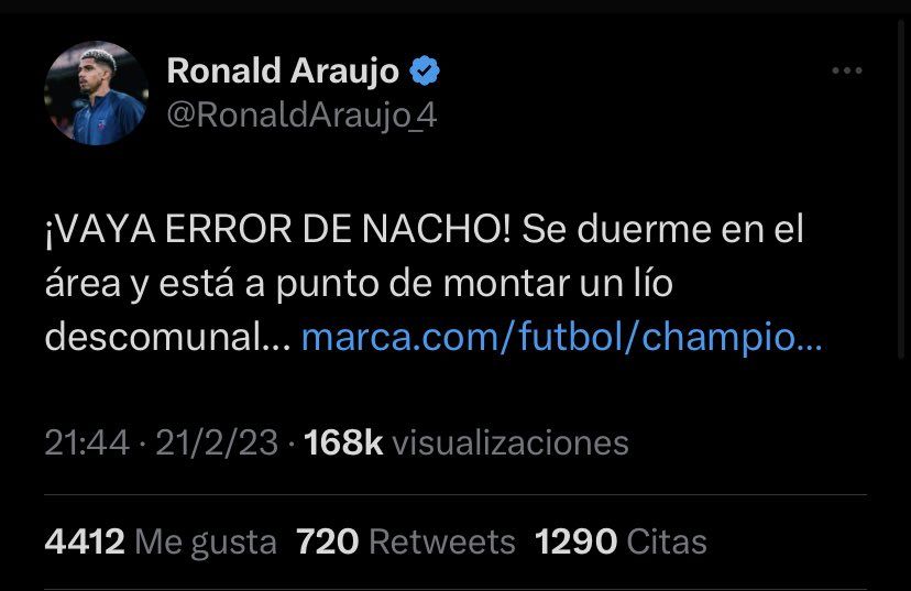 Mientras el Real Madrid disputaba la ida de los octavos de final de la Champions League ante el Liverpool (2-5), un mensaje de Ronald Araújo en Twitter encendió las redes sociales. En el perfil del central del FC Barcelona apareció el mensaje "¡VAYA ERROR DE NACHO! Se duerme en el área y está a punto de montar un lío descomunal...", el cual fue escrito por un hacker.