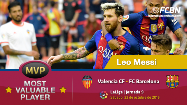 Otra vez y por segundo partido consecutivo, Lionel Messi fue el mejor jugador del FC Barcelona, en este caso ante el Valencia CF. El genio rosarino fue determinante para que los blaugranas salieran vivos y con los tres puntos del infierno de Mestalla. Desde "FCBN" hemos renovado el "MVP" del diez en este partido (igual que ante el City) por todo lo que ha demostrado sobre el terreno de juego.