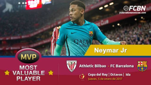 Si bien es cierto que la decisión de colocar a Neymar Jr como el "MVP" del FC Barcelona contra el Athletic de Bilbao puede que sorprenda a más de un aficionado, la realidad es que el atacante brasileño del Barça fue el jugador más intenso del bando azulgrana en la ida de octavos de Copa del Rey 2016-17, llevando peligro continuamente y provocando una gran cantidad de faltas a favor, como la que propició el gol de Leo Messi.