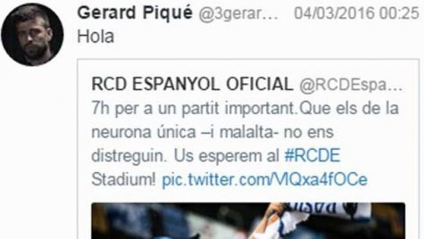 "7 horas para un partido importante. Que los de la neurona única -y enferma- no nos distraigan", colgó en las redes el club blanquiazul. Gerard Piqué, un pozo de ironía, replicó el mensaje con un sencillo "Hola", dándose por aludido al mensaje perico.