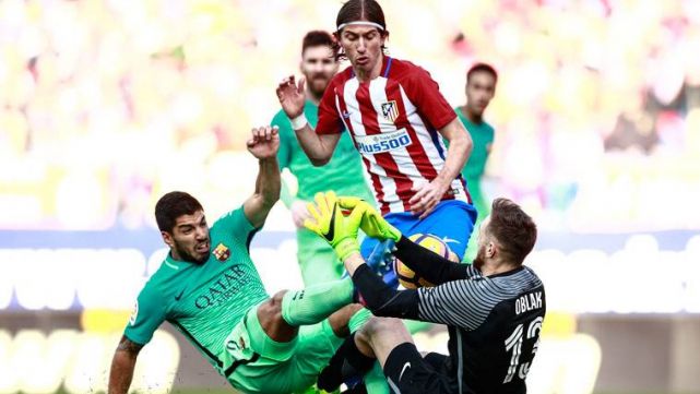 Fue una jugada en la que participaron los tres miembros de la "MSN". Jan Oblak despejó un tiro de Leo Messi y Luis Suárez acudió al rechace, que había quedado a pocos metros del guardameta esloveno. Se vivió una pugna entre ambos futbolistas por el balón, pero Mateu Lahoz señaló falta después de que Luis Suárez contactara con la pierna contra el portero del Atlético de Madrid.
