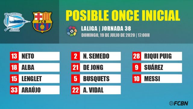 - FC Barcelona: Neto; Semedo, Araújo, Lenglet, Jordi Alba; Riqui Puig, Busquets, De Jong, Arturo Vidal; Messi y Suárez.