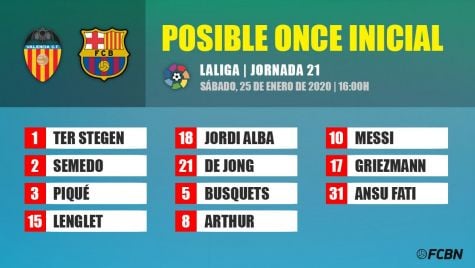 - FC Barcelona: Ter Stegen; Semedo, Piqué, Lenglet, Alba; De Jong, Busquets, Arthur; Messi, Griezmann y Ansu Fati.