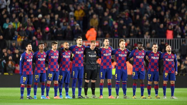 En la alineación inicial, que no fue especialmente novedosa, ya se contaban seis canteranos, la mayoría veteranos aunque con alguna chispa de juventud. De atrás hacia adelante aparecieron los laterales Sergi Roberto y Jordi Alba, el central Gerard Piqué, el pivote Sergio Busquets y el atacante Leo Messi, a los que se unió, debido a la delicada baja de Luis Suárez, un extremo, en este caso derecho, como Ansu Fati.