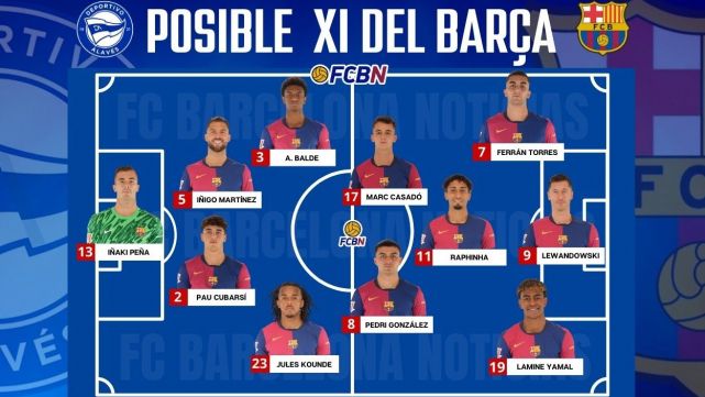 - XI titular del FC Barcelona: Iñaki Peña, Koundé, Pau Cubarsí, Íñigo Martínez, Balde; Casadó, Pedri, Raphinha; Lamine Yamal, Ferran Torres y Lewandowski