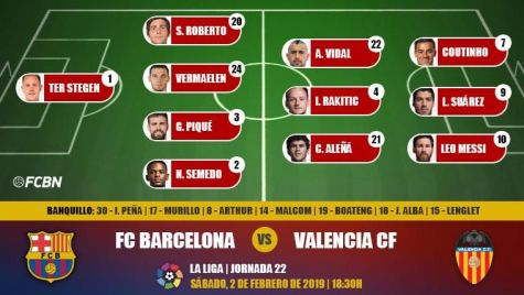 Estos son los once jugadores titulares del FC Barcelona para el duelo contra el Valencia de la vigésimosegunda jornada de LaLiga Santander: Ter Stegen; Sergi Roberto, Piqué, Vermaelen, Semedo; Rakitic, Aleñá, Arturo Vidal; Messi, Suárez, Coutinho